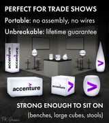 Our branded items are popular for trade shows and exhibitions. Our larger cubes and benches are strong enough to sit on.